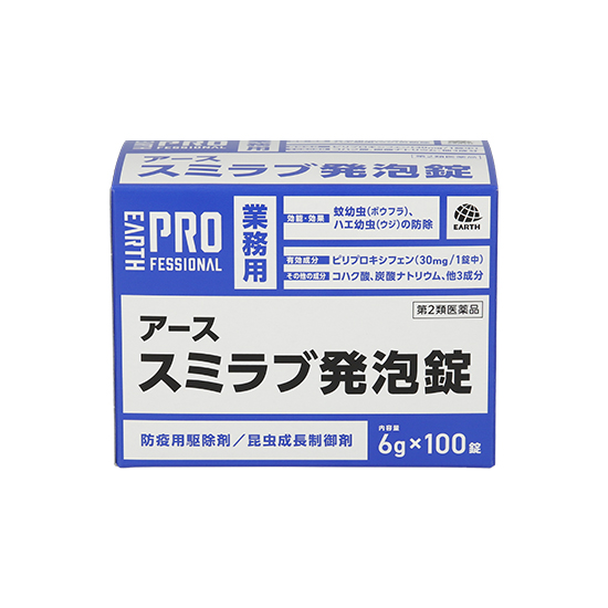 | 蚊幼虫(ボウフラ) | 流水域の場合:水量1m3につき1〜2錠 (有効成分0.03〜0.06ppm)を発生場所に そのまま投入すること。 静止水域の場合:水量2m3につき1錠 (有効成分0.015ppm)を投入すること。 |