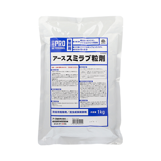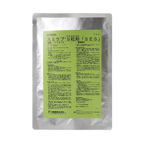 | ハエ幼虫(ウジ) | 直接散布:1m2につき20gを発生場所にそのまま均一に散布する。 希釈液散布:1m2につき50倍希釈液1Lを幼虫の発生場所に散布する。 ゴミや堆肥の場合は、よく内部までしみ込むように、100倍に希釈して散布量を2倍とする。 |